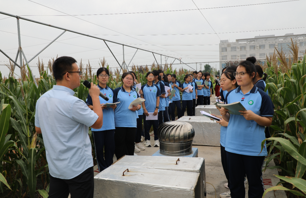 研学队伍走进试验田,田间相邻两个小区玉米的长势形成鲜明对比,在工作人员的引导下,学生们从株高、茎粗、叶片颜色等指标分析施肥对作物生长的影响。在观察过程中,工作人员讲解了科学施肥对保障粮食安全和耕地质量的重要意义。学生们边听边记录,对“科学施肥护粮”的实践意义有了更深刻的体会。