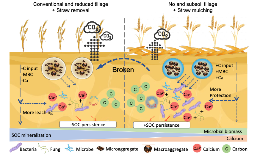 保护性耕作碳汇潜力受土壤类型、矿物组成等调控,但活性矿物如何影响其团聚体形成和有机碳循环转化的内在过程尚不明确。该研究以黑土、黄绵土、褐土保护性耕作长期定位试验为平台,深入探讨了有机碳积累和稳定性的机制。黑土区,保护性耕作可促进无定形和复合态氧化铁生成,选择性结合芳香-碳官能团,形成化学性质稳定的铁结合态有机碳,使0-20cm土层有机碳提升13.6%-17.9%;黄绵土和褐土中免耕和深松覆盖促进碳酸钙向交换性钙转化,通过钙离子桥接固持有机碳,减少总矿化14.3%-33.2%,同时钙离子与革兰氏阴性菌和丛枝菌根真菌的比例呈正相关,改善了微生物群落组成,有利于微生物副产物在矿物表面的附着和长期稳定;研究还证实了保护性耕作下矿物离子、有机无机复合体及微生物生物量的增加,可促进大团聚体形成,强化有机碳物理保护;基于区域分异机制与共性规律,研究构建了“矿物活化-团聚体形成-有机碳稳定”的理论。