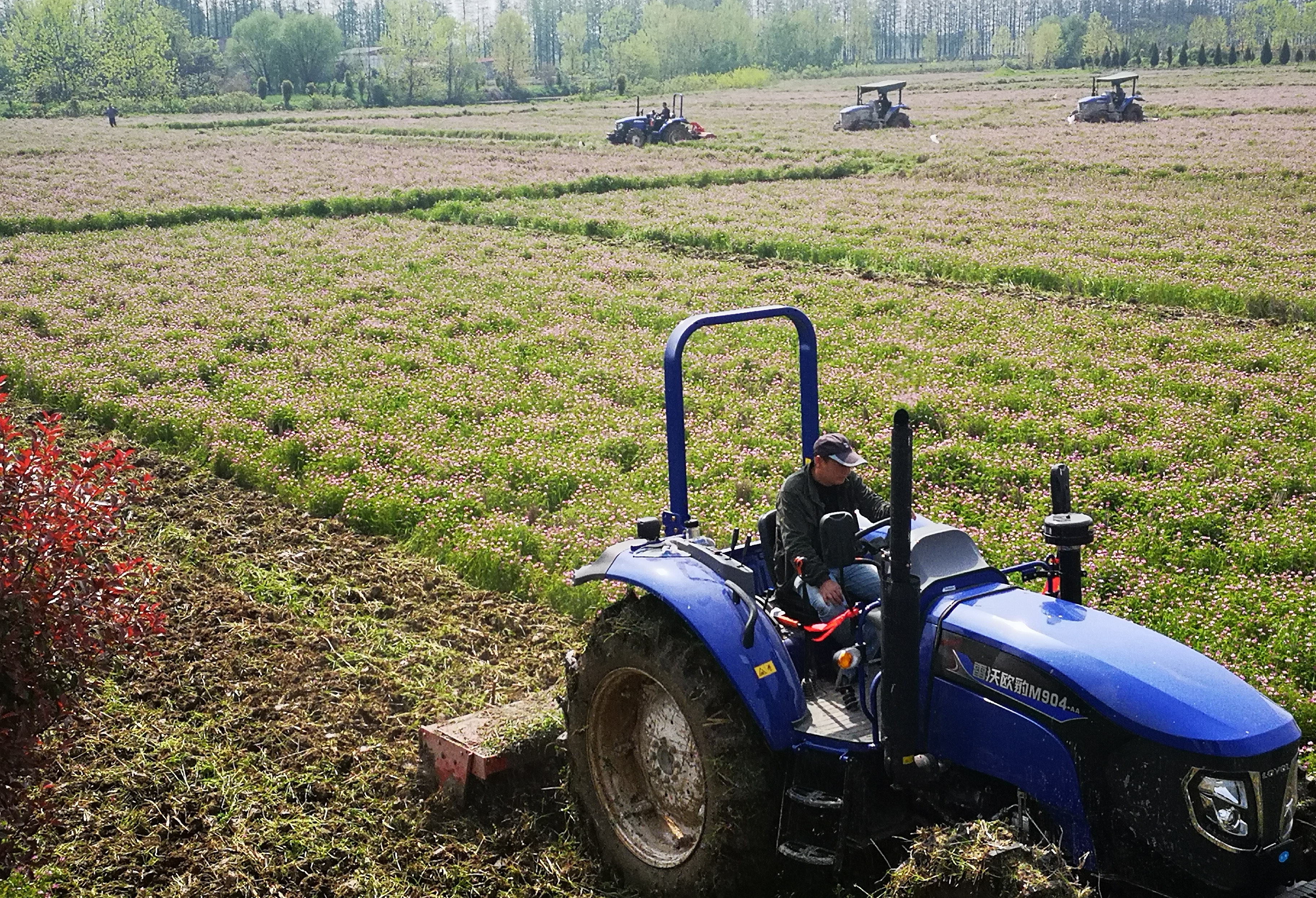 河南省信阳市罗山县子路镇朱湾村的绿肥种植示范基地,农机手操作雷沃欧豹1204型轮式拖拉机进行“信紫1号”紫云英翻压还田作业。资料图