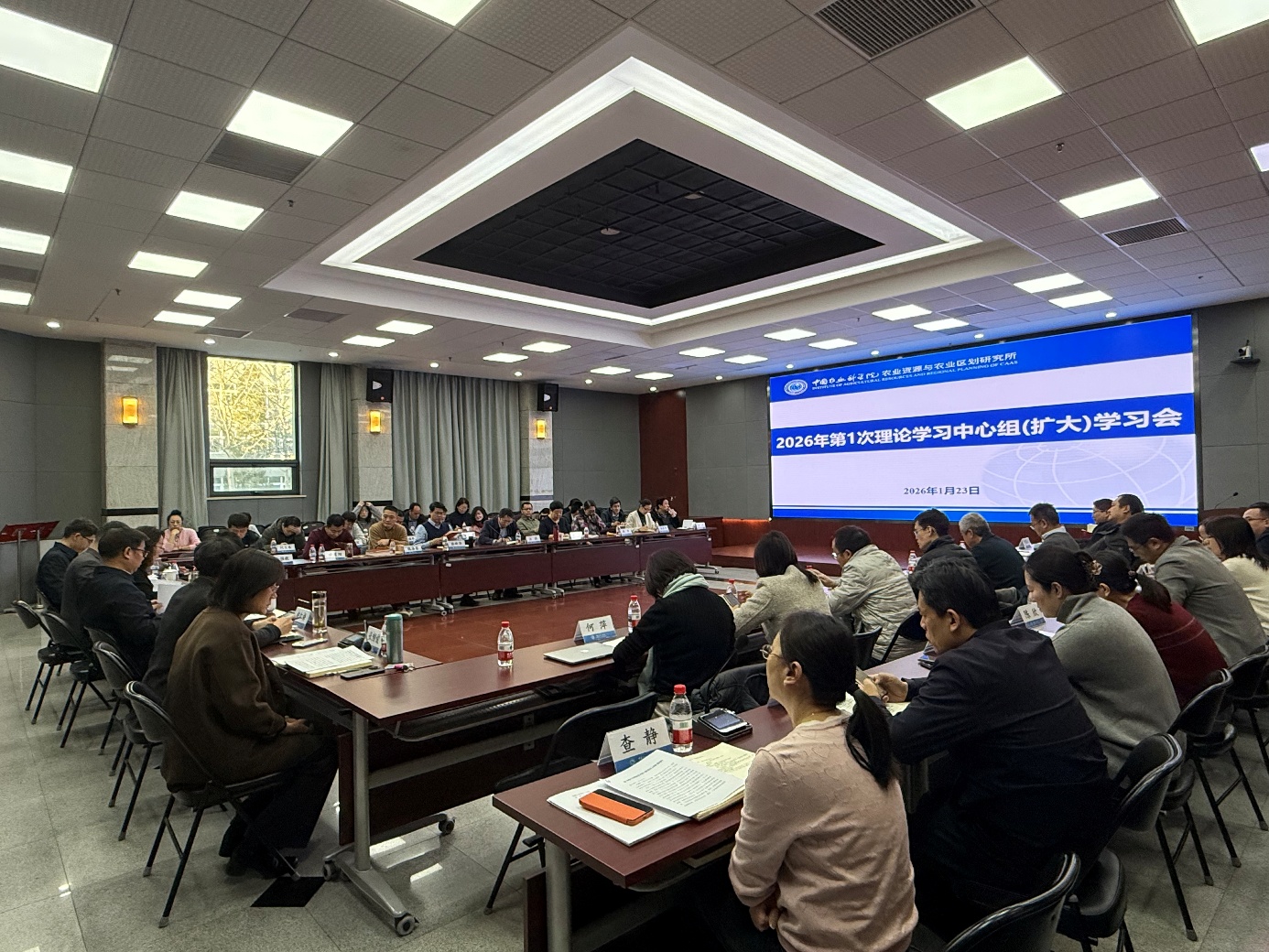 1月23日上午,资划所召开2026年度第1次理论学习中心组(扩大)学习会,传达近期重要会议、讲话精神,通报典型案例,并开展交流研讨。会议由党委书记王秀芳主持,所班子成员、所党委委员、纪委委员、团队首席、青年助理首席、部门负责人、在职支部书记、副处级及以上干部50余人参会。