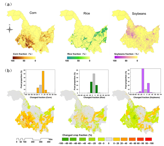 Figure 2. The crop distribution map of Heilongjiang Province via the integration of MODIS data and agricultural statistics, where “a” is the crop abundance map optimized by the IAGSA method and “b” is the crop abundance variation and variation statistics before and after optimization