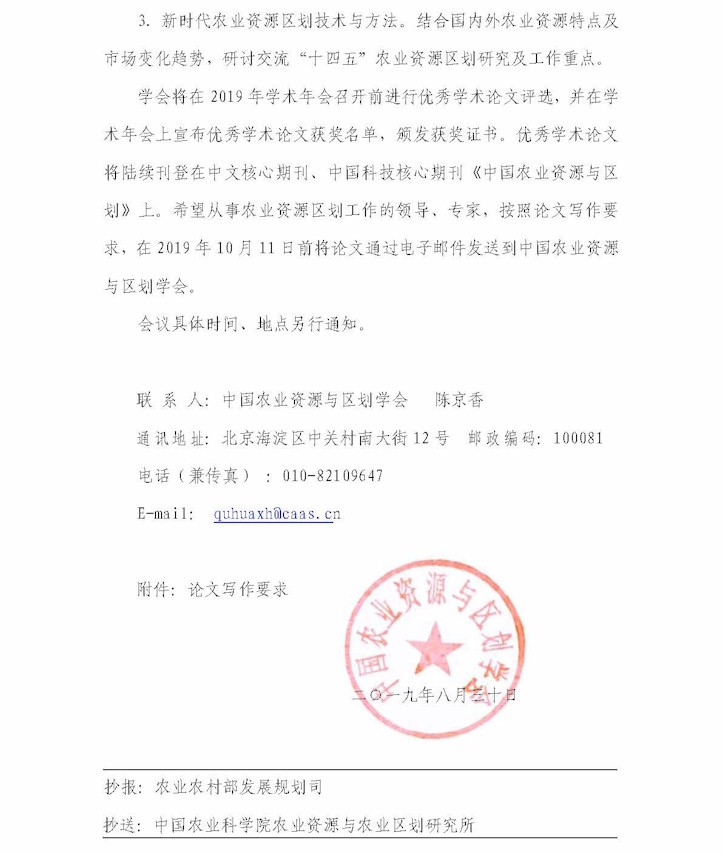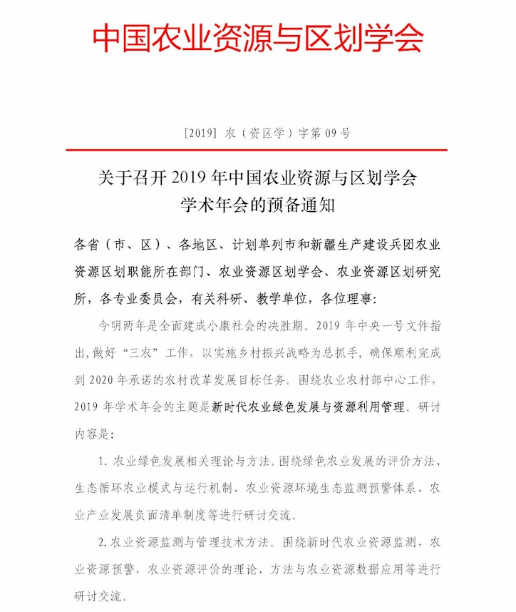 关于召开2019年中国农业资源与区划学会学术年会的预备通知