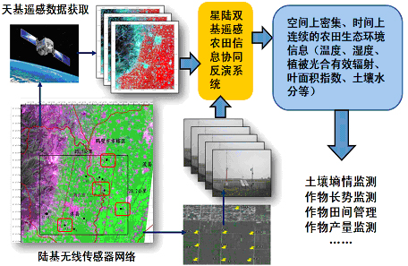 2、突破了陆基无线传感器网络与星载遥感数据协同的农田参数定量反演关键技术。首次研发了田间叶面积指数传感器,实现了田间冬小麦和玉米全生育期叶面积指数的自动连续观测;应用普适性尺度转换模型和HANTS算法等,开发了叶面积指数(LAI)和光合有效辐射吸收比率(FPAR)的空间和时间尺度转换模型;提出了星陆双基数据协同的地表温度、光合有效辐射、叶面积指数、干旱指数、土壤水分缺失指数等7类农田参数的定量反演技术方法,其中地表温度、光合有效辐射、叶面积指数比单独遥感反演精度提高了5%以上,植被干旱指数和土壤水分缺失指数等比单独遥感反演精度提高了10%以上。