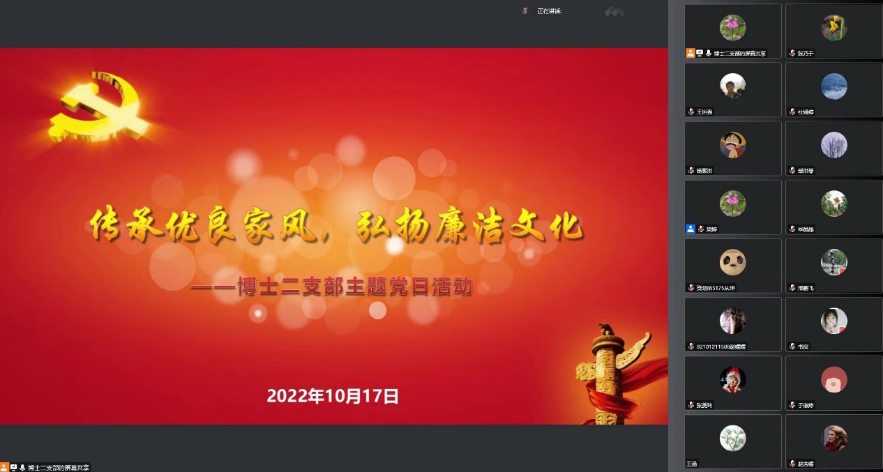 2022年10月17日,博士二支部线上开展了“传承优良家风,弘扬廉洁文化”主题党日活动,支部全体党员参加了本次活动,活动由支部书记梁婷主持。