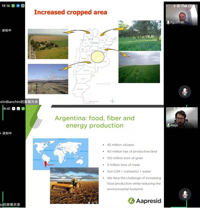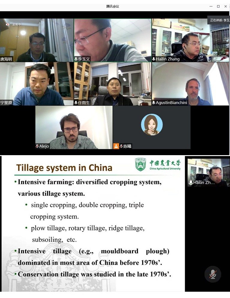 为推进农业农村部国际合作项目“中国-阿根廷保护性耕作制度交流与合作”顺利实施,我所土壤耕作与种植制度团队邀请阿根廷保护性耕作研究推广专家Prof. Agustin Bianchini(Conservation Agriculture from Okandu, Argentina)、Prof. Alejo Ruiz(Aapresid-The Argentine Association of No Till Farmers),以及来自中国农业大学张海林教授和任图生教授、山东农业大学宁堂原教授、湖南省土壤肥料研究苏唐海明研究员,通过网络视频形式开展了中国-阿根廷保护性耕作学术交流研讨会。会议由团队首席李玉义研究员主持。