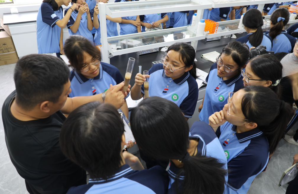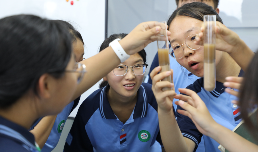 要想改良盐碱地,就要详细了解盐碱地的特点,在工作人员的指导下,学生们好奇地拿起试管里的两种土仔细观察,并通过过滤试验对比盐碱土与常规田园土两种土壤的过滤速度,随后通过pH试纸测定土壤酸碱度,在对比和观察中,学生们瞬间明白“为何盐碱地难种庄稼”。试验过程中,学生们分工明确、互相配合,仔细记录每一组数据,在亲手操作中深化了对盐碱土特性的科学认知,也感受到了科研工作的严谨性。