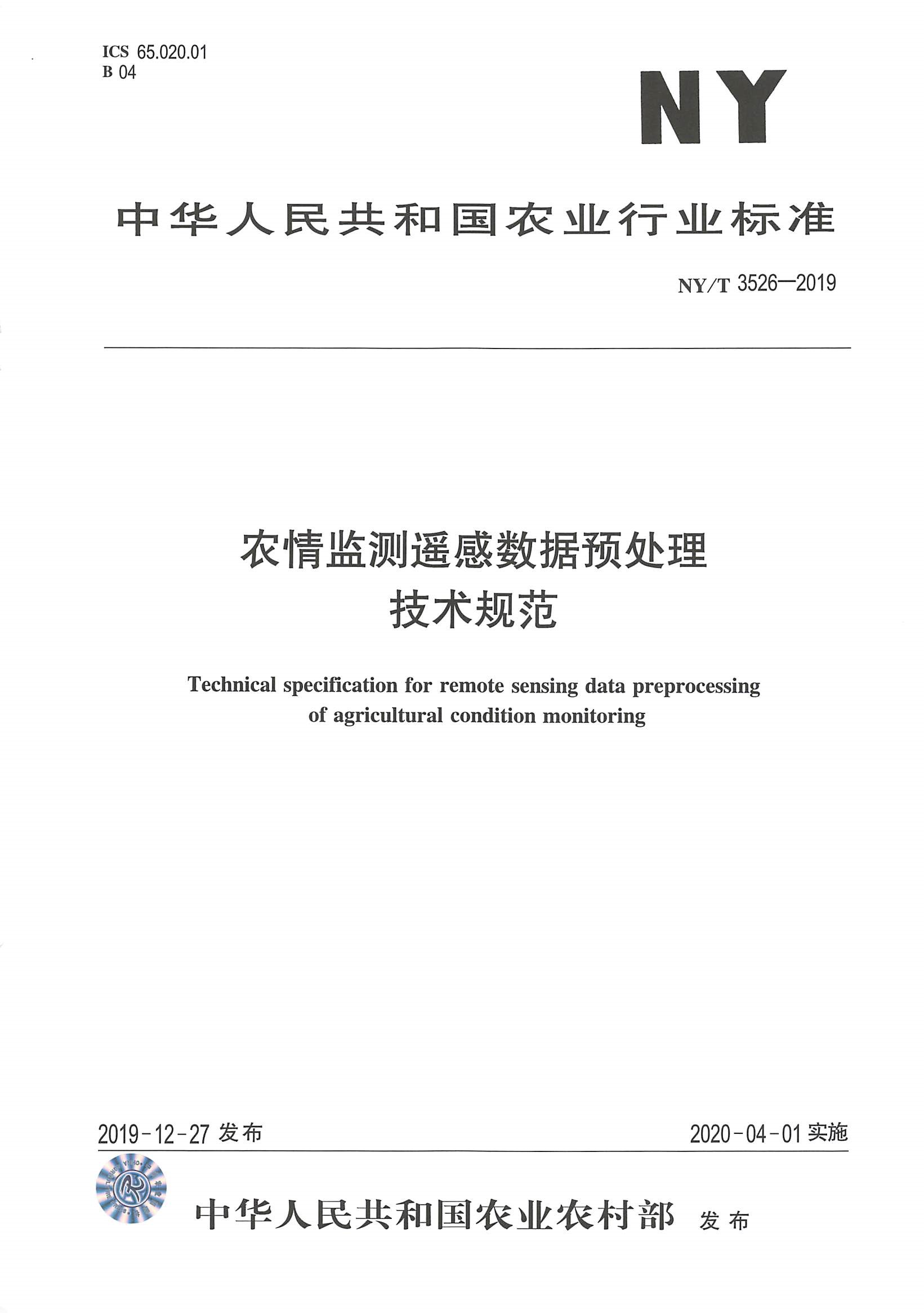 由中国农业科学院农业资源与农业区划研究所主持制定的《农情监测遥感数据预处理技术规范》(NY/T 3526-2019)、《农作物种植面积遥感监测规范》(NY/T 3527-2019)、《耕地土壤墒情遥感监测规范》(NY/T 3528-2019)三项标准,获农业农村部批准发布为农业行业标准,自2020年4月1日起实施。标准主要起草人员包括王利民、刘佳、姚艳敏、邓辉、滕飞、李丹丹等。