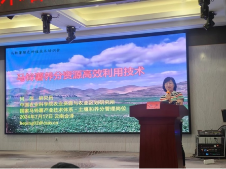 为了加快马铃薯科技成果推广应用,助推云南曲靖马铃薯产业绿色高质量发展,7月16-18日,国家马铃薯产业体系曲靖综合试验站、国家重点研发计划滇西边境山区绿色健康种养殖项目会泽课题组和国家乡村振兴重点帮扶县会泽科技特派团马铃薯产业组,共同在会泽县举办“2024年马铃薯绿色种植技术培训观摩会”。体系岗位专家就马铃薯新品种选育、病虫害防控、养分管理和种薯贮藏等进行技术培训,示范县骨干、农技人员、合作社负责人和种植大户等100余人参加培训。国家马铃薯产业技术体系土壤和养分管理岗位专家何萍研究员参加了会议,并在会上作了“马铃薯养分资源高效利用技术”专题讲座,并现场演示了马铃薯智能化推荐施肥技术的使用方法。