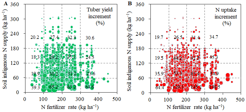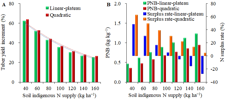 本研究基于团队于2004−2020年在中国马铃薯主产区开展的田间试验,通过模拟施氮量和土壤氮素供应对马铃薯产量增量和氮素吸收增量的响应关系发现,产量增量随着施氮量的增加呈线性加平台关系,氮素吸收增量则呈线性加线性关系。当前我国马铃薯主产区土壤氮素供应平均可贡献马铃薯63.5%的氮素需求。研究采用抛物面非线性回归模型模拟分析施氮量和土壤氮素供应对马铃薯产量增量和养分吸收增量的交互作用,通过设置不同土壤氮素供应情景,综合考虑氮素表观平衡和氧化亚氮排放得出了中国马铃薯种植区不同目标产量下的施氮量范围。研究结果有助于指导马铃薯产业实现可持续生产,为促进我国化肥减量增效、加快推进马铃薯产业绿色转型提供科技支撑。
