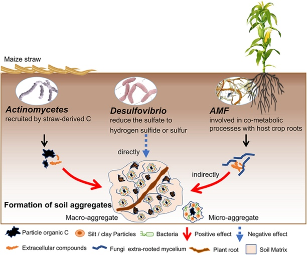 研究结果表明,长期免耕条件下,施氮量对团聚体分布无明显影响,但增加了所有团聚体级别土壤有机碳含量。长期免耕配合适宜氮用量对表层土壤微生物群落有积极影响,特别是丛枝菌根真菌和放线菌,该研究明确了团聚体内微生物调控土壤团聚体特征的代表性策略。放线菌可能被作物秸秆所招募,并通过降解秸秆参与团聚体的形成,增加大团聚体的土壤有机碳含量。相反,脱硫弧菌生物量直接抑制土壤团聚体的形成,降低大团聚体土壤有机碳含量。丛枝菌根真菌生物量通过与作物根系的共代谢过程,间接促进土壤团聚体的形成,并在大团聚体中增加土壤有机碳含量。
