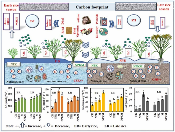 随着全球人口增长,水稻生产面临增产与减排的双重挑战。传统化肥过量使用加剧温室气体排放,而有机肥替代被认为是可持续农业的重要途径。然而,长期有机肥替代对稻田净温室气体排放、碳足迹及碳汇效率(CSR)的影响机制尚不明确。团队基于中国农业科学院祁阳红壤实验站始于1982年的长期定位试验,对比了四种施肥模式:不施肥(CK)、纯化肥(NPK)、全量牛粪替代化肥(M)、牛粪与化肥配施(NPKM)。通过整合温室气体监测、土壤酶活性分析及碳汇计算等方法,从碳收支平衡角度评估了有机替代的环境与经济效益。