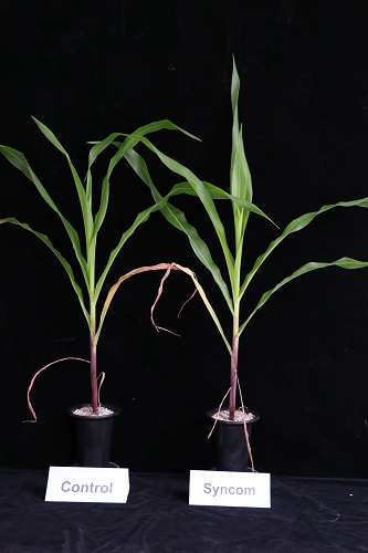 玉米接种固氮合成菌群(SynCom)和未接种(Control)第35天生长情况。     中国农科院供图