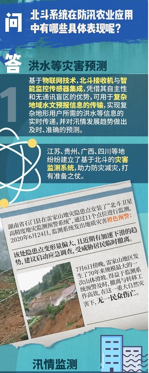 其实,北斗系统早已悄悄走进我们的生活,在防汛农业生产上也发挥着重要的作用。今年汛期,北斗还立了大功,在湖南石门县雷家山山体滑坡来临前,北斗监测预警系统提前发出预警,所有人员得以安全及时转移。除了作为监测利器,北斗系统还有哪些“神操作”?请看本期《“汛”息关键问答》。