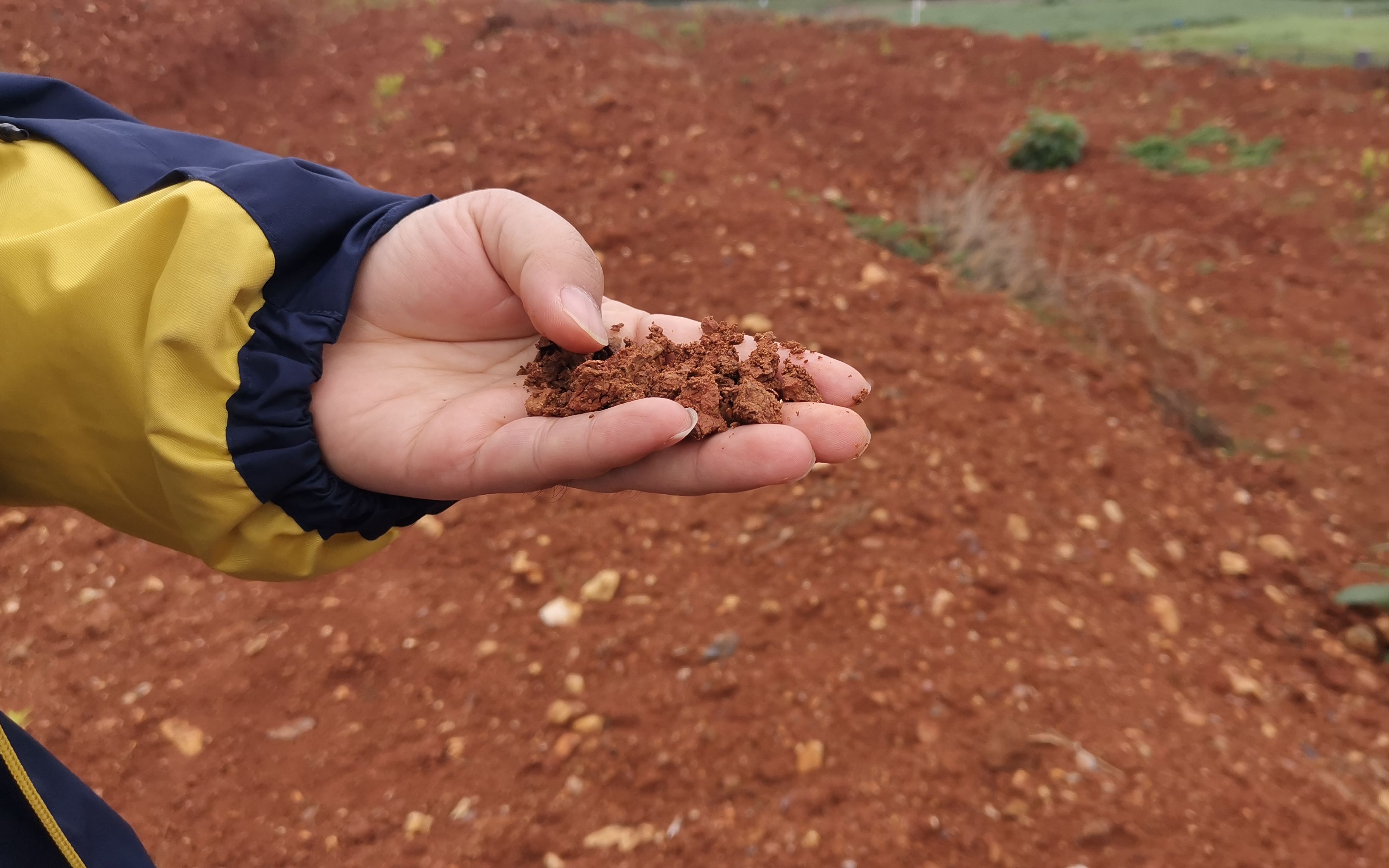 “祁阳这里,是典型的第四纪红色黏土发育的红壤,”蔡泽江抓起一把红土,黏成块状的红土上,可以看到很多不同颜色的斑点或条纹,“这些都表明土壤中的各种金属元素矿物类型和含量存在明显差异,从这些颜色可以看出,这块地里的土壤确实很贫瘠”。