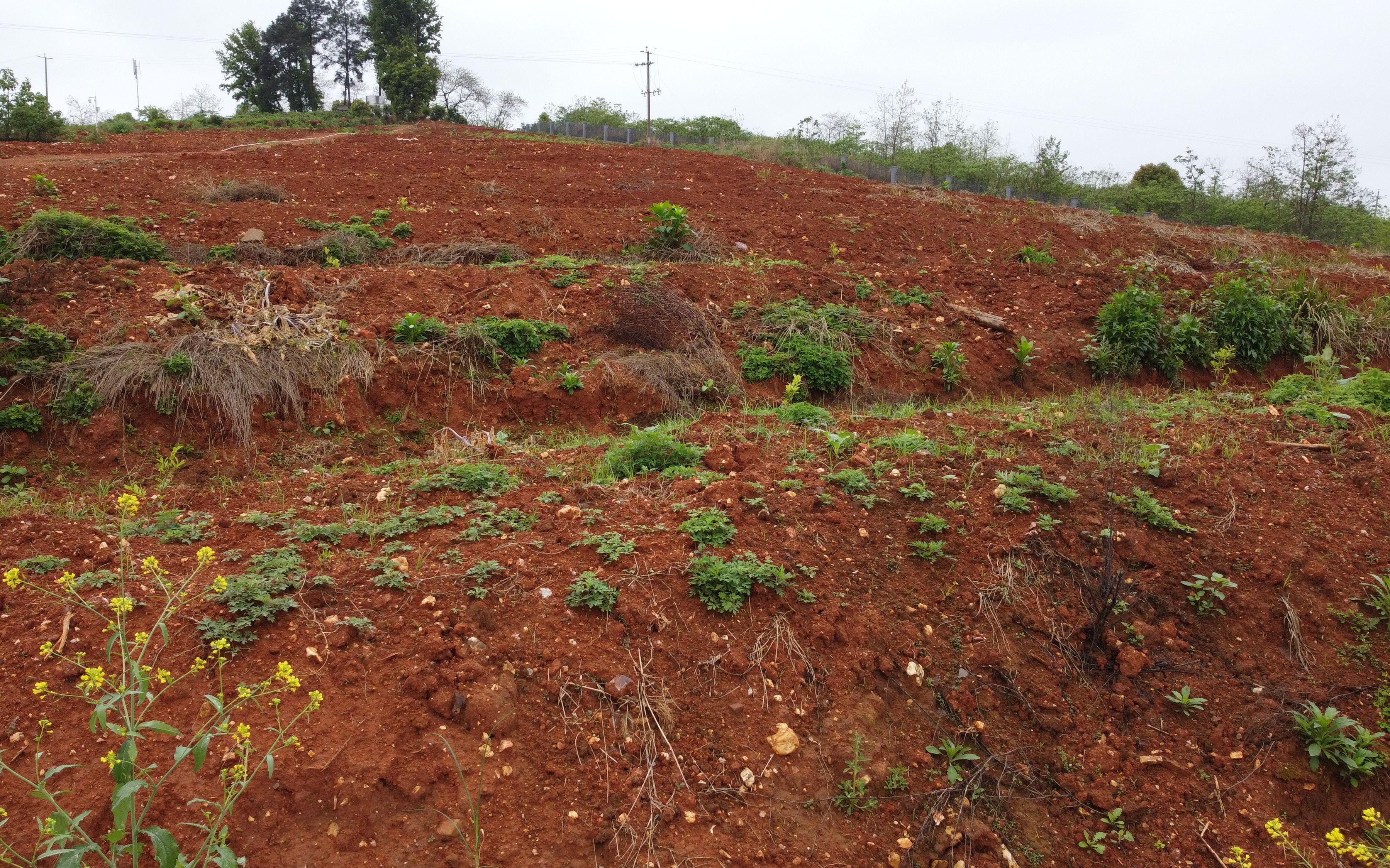 祁阳站建在一座低矮的丘陵前,身后的丘陵,被划分成一个个扇形区域,大部分种上了作物,一片青翠,只有一小块还在整地,裸露出鲜红的土壤。