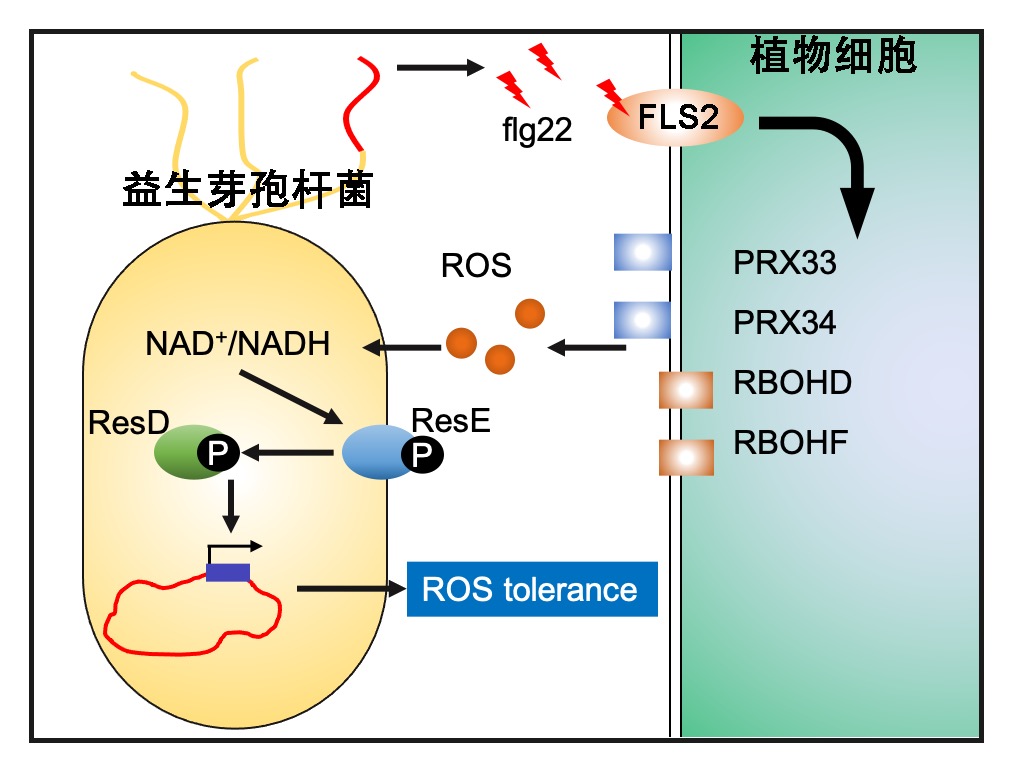 植物能够识别细菌的保守分子并产生基础免疫,并伴随着活性氧的爆发,从而抵抗微生物的定殖。研究发现芽孢杆菌和它的鞭毛多肽(flg22)能够引起根系的活性氧爆发,然而活体的病原菌由于对植物免疫的抑制和逃逸策略,并未激发植物的活性氧爆发。研究发现益芽孢杆菌却能够比病原菌耐受数倍浓度的活性氧。该研究证明芽孢杆菌的一类保守的双组分调控系统ResDE参与了对活性氧的耐受并促进了芽孢杆菌的根际定殖。