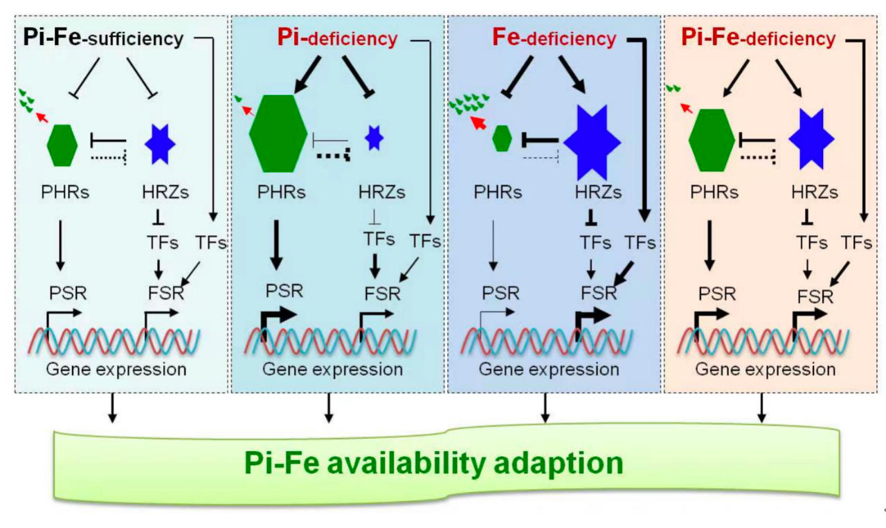 科研团队研究发现,磷养分信号中心调控因子(PHRs)和铁养分信号核心调控因子(HRZs)共同介导了磷-铁信号的互作过程。PHRs和HRZs通过相互抑制调控各自的蛋白和转录水平,以此来调控下游磷饥饿响应基因和铁饥饿响应基因的表达,从而应对土壤不同的磷-铁养分供应变化,以保证作物的生长需求。
