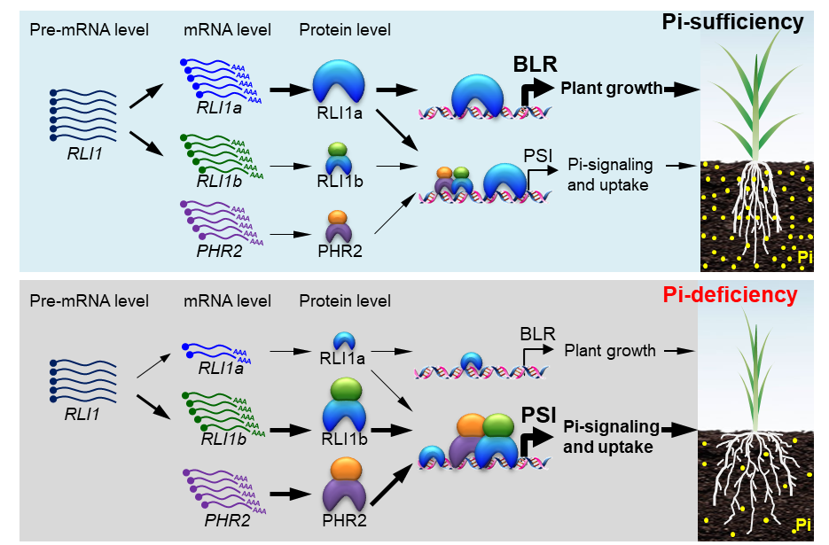 研究团队基于前期报道的土壤磷素调控水稻株型的重要调控因子RLI1,进一步发现RLI1基因存在可变剪切现象。RLI1的可变剪切能产生两种蛋白亚型:RLI1a(包含MYB DNA结合域)和RLI1b(包含MYB和CC结构域)。两种蛋白亚型在外界磷素养分供应充足和缺乏条件下行使着不同的功能。当土壤有效磷供应充足时,水稻大量积累RLI1a亚型蛋白并激活油菜素内酯的合成及信号转导,以此促进磷养分充足条件下的高效生长。当土壤有效磷供应不足时,RLI1b亚型蛋白大量积累,其与磷素核心调控因子PHR2协同激活磷饥饿应答信号,以提升水稻从外界获取磷养分的能力,促进体内磷养分的高效周转再利用,以此来帮助水稻抵御低磷胁迫。进一步的研究发现,RLI1通过可变剪切来整合磷信号、磷平衡及生长的调控机制在被子植物中都是普遍存在的。该保守机制的解析,为今后培育株型理想磷养分高效的作物提供理论依据。