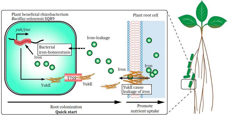 该研究以生产上广泛应用的微生物肥料菌种贝莱斯芽孢杆菌SQR9为研究材料,发现其Ⅶ型分泌系统分泌的YukE蛋白能在菌-植互作早期直接插入根细胞膜,导致短暂性的根细胞铁泄漏,从而快速获取铁从而启动根表定殖。这种“先借后还、借少还多”的菌-植互作,代表了一种全新的根际益生菌-植物之间的互作模式,为根际益生菌为代表的微生物肥料高效发挥作用提供了理论指导。