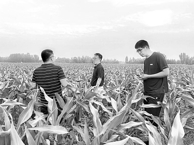 团队首席科学家李玉义(中)在调研盐碱地玉米长势情况。资料图片