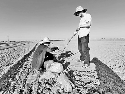 团队成员李晓彬(右)在内蒙古鄂尔多斯市达拉特旗重度盐碱地试验区取土样。资料图片