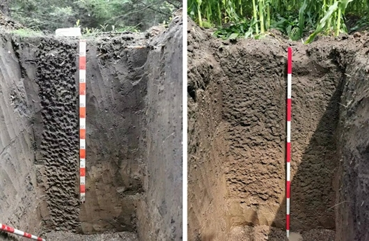 相距100米的两个剖面(平地):左图为退耕还林的黑土层105厘米;右图为长期种植农作物黑土层85厘米。张斌供图