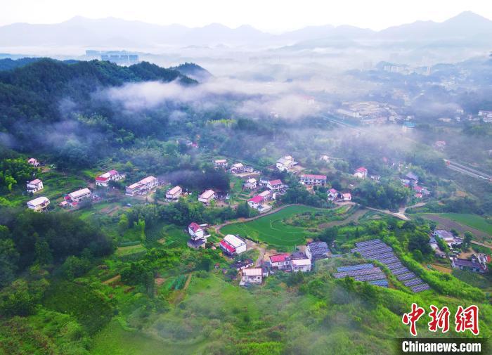 资料图:苍翠的青山、错落有致的民居、通村达户的道路与云雾交相辉映。 吴均奇 摄