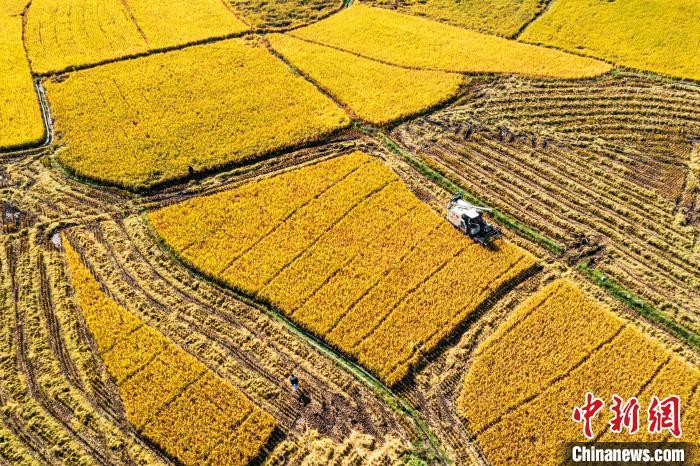资料图:湖南东安高标准农田晚稻开镰收割。蔡小平 摄