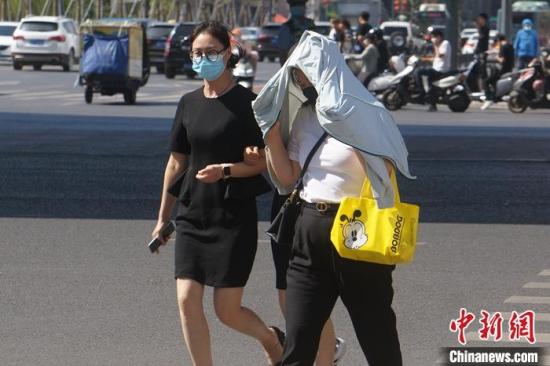 6月17日,河南郑州,出行市民用衣物遮阳。超40℃高温持续在河南多地上演。河南省气象局解析该省此轮高温天气的成因主要受地面暖低压影响,出现晴热少雨天气,多地最高气温超40℃。 中新社记者 韩章云 摄