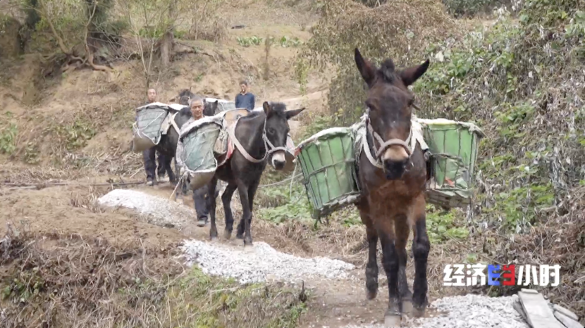 贵州遵义龙坪镇龙坝社区,公路边堆满了建筑材料,村民们在背篓里装满砂石材料,再用马匹运到300米外的施工现场。眼前的这条羊肠小道,便是村民们下地劳作的必经之路,最窄的地方只有二三十公分。当地只能使用最原始的运输方式——马帮,来运输建筑物资。