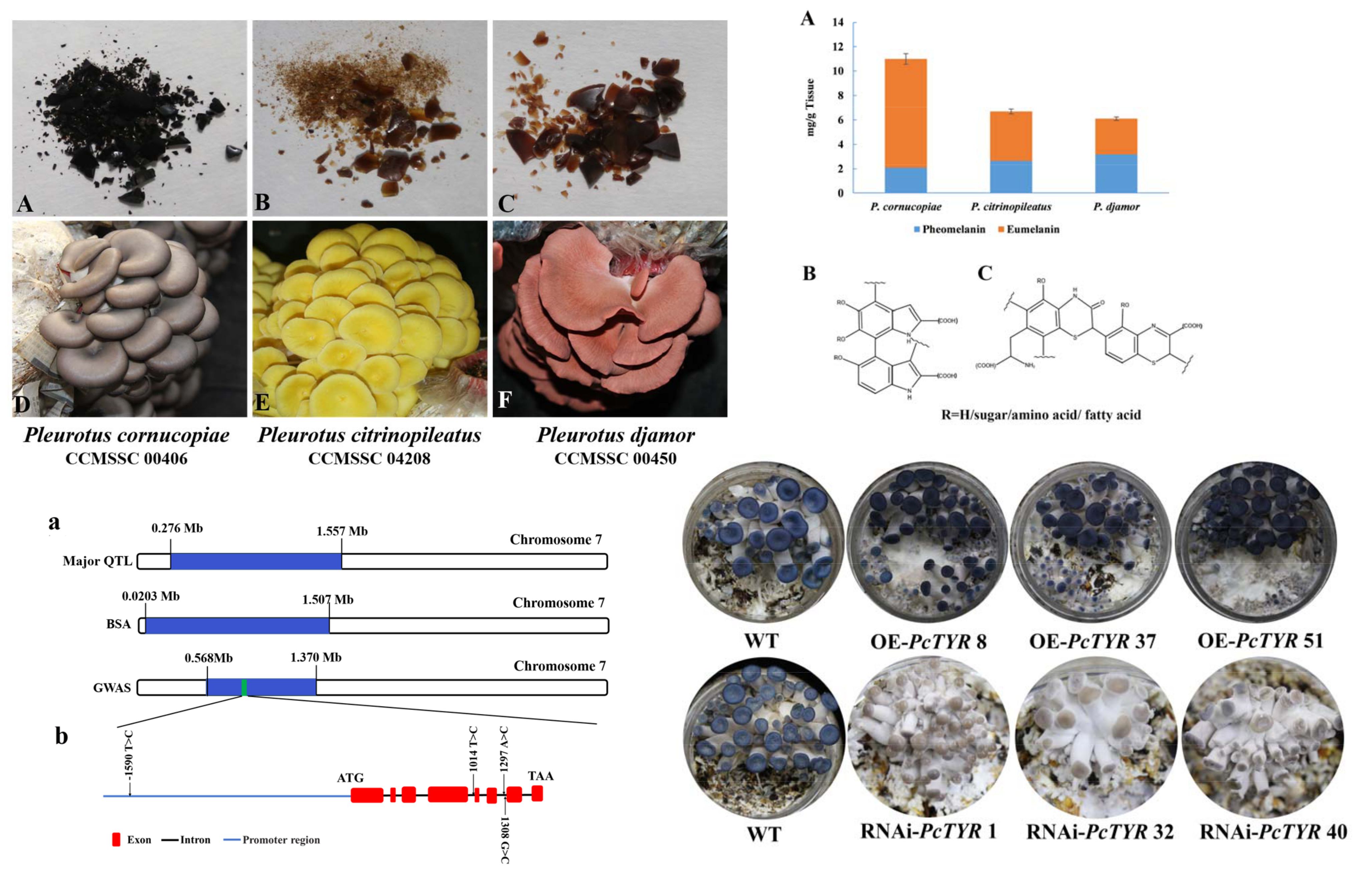 图为平菇子实体、色素含量和分子式及颜色调控QTL位点和基因功能验证,中国农业科学院农业资源与农业区划研究所供图
