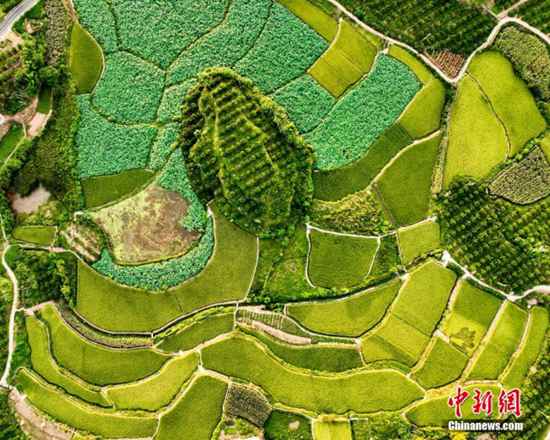 四川省南充市蓬安县将高标准农田建设和撂荒地治理同美丽乡村建设、人居环境改善等工作紧密结合,助力乡村振兴。图为色彩斑斓的稻田。 刘永红 摄