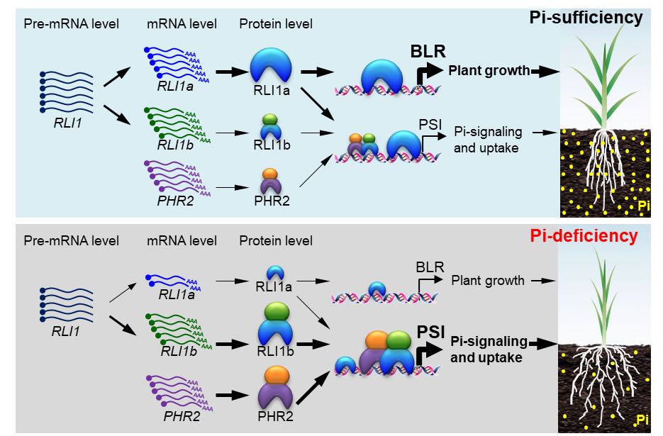 研究团队基于前期报道的土壤磷素调控水稻株型的重要调控因子RLI1,进一步发现RLI1基因存在可变剪切现象。RLI1的可变剪切能产生两种蛋白亚型:RLI1a(包含MYB DNA结合域)和RLI1b(包含MYB和CC结构域),两种蛋白亚型在外界磷素养分供应充足和缺乏条件下行使着不同的功能。当土壤有效磷供应充足时,水稻大量积累RLI1a亚型蛋白并激活油菜素内酯的合成及信号转导,以此促进磷养分充足条件下的高效生长。当土壤有效磷供应不足时,RLI1b亚型蛋白大量积累,其与磷素核心调控因子PHR2协同激活磷饥饿应答信号,以提升水稻从外界获取磷养分的能力,促进体内磷养分的高效周转再利用,以此来帮助水稻抵御低磷胁迫。