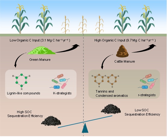 土壤有机碳是维持土壤肥力、缓解气候变化的关键要素。绿肥和牛粪均能有效提升土壤有机碳,但二者长期效应及差异化机制尚不明确。