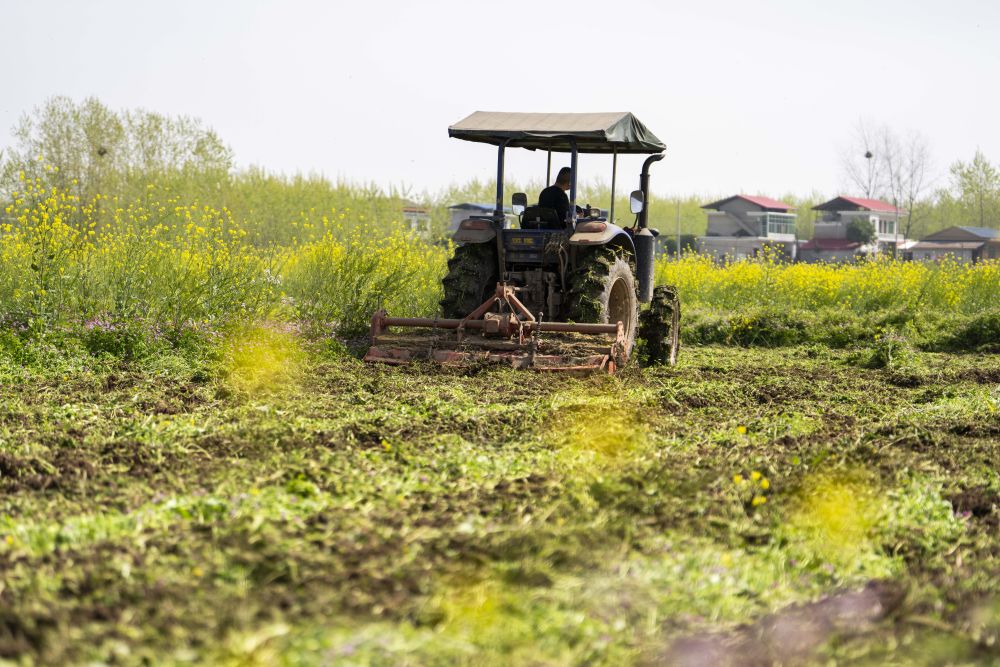 在普绿园种植合作社,300多亩“稻稻肥”基地里,金黄色的油菜花和紫红色的紫云英在阳光照射下鲜艳夺目,一台台旋耕机正忙着将它们翻耕进地里,作为即将播种的水稻绿肥。