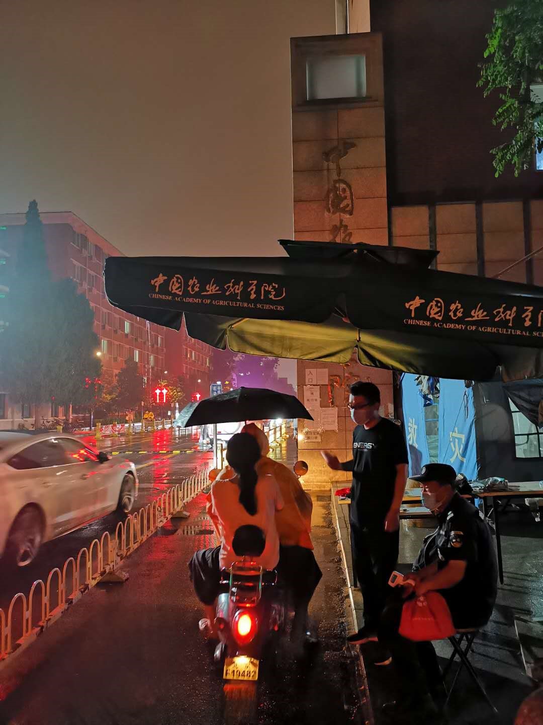 团队首席罗其友也积极报名并提前到达南门参与防控值守,见到前来探望的退休教师陶陶说,“我虽然不是党员,但这是我们支部、我们团队的集体决策,我是一份子,我没有理由不参加呀”,罗主任笑眯眯地说着。外出调研赶回的尤飞、周振亚,散会后马上回院的屈宝香、张晴与大家一起参加了这次特殊的主题党日活动。天黑以后,结束加班的同事冒雨陆续到门口协助值班的同事坚守岗位。