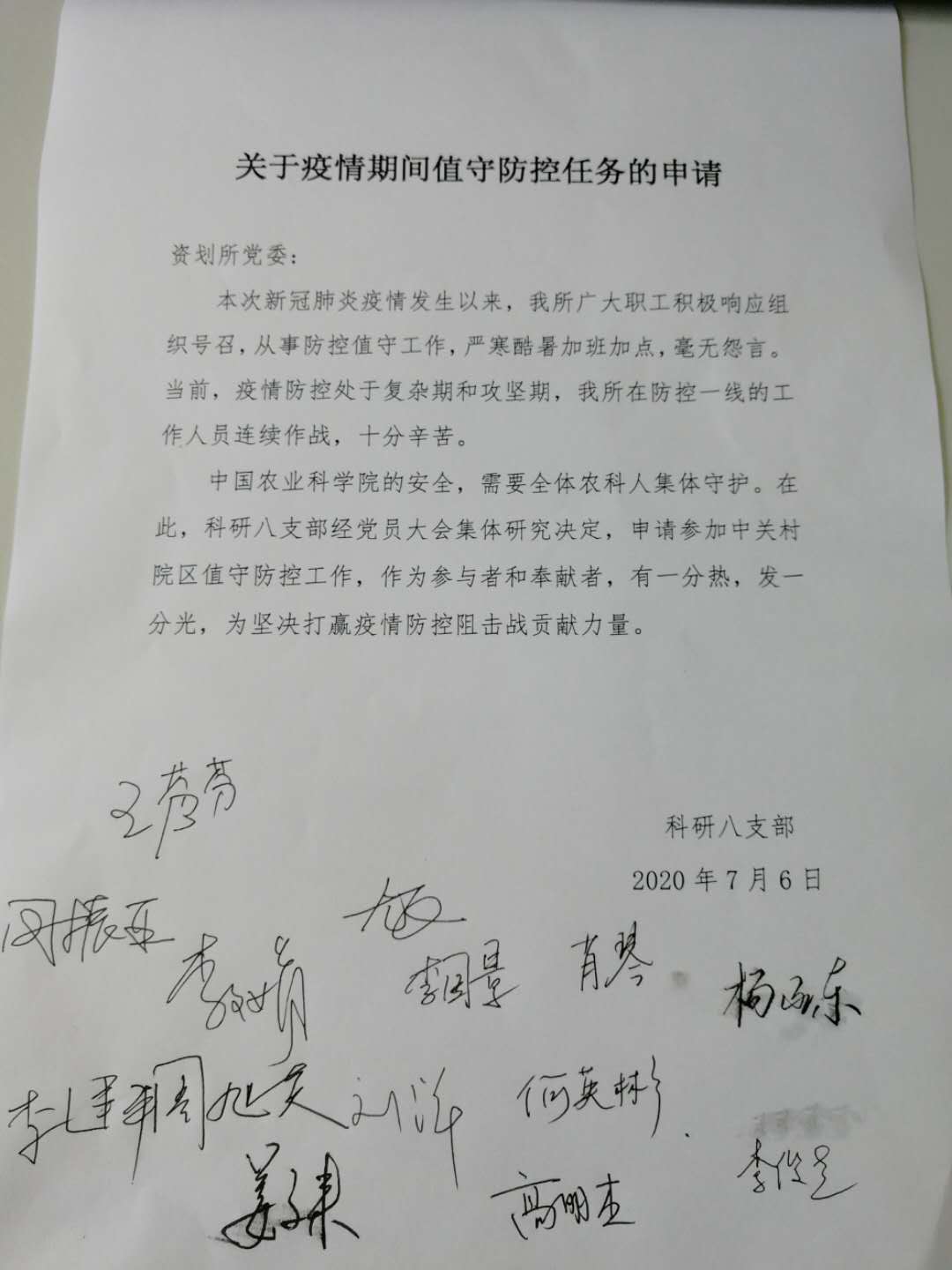 “职能部门的同事已经非常辛苦了,我们是研究所一份子,更是共产党员,我们理应为全所疫情防控出一份力。如果这次还不同意,我们就一直申请下去”。7月6日,科研八支部党员大会集体决定,向所党委申请参加院区疫情防控值守工作。