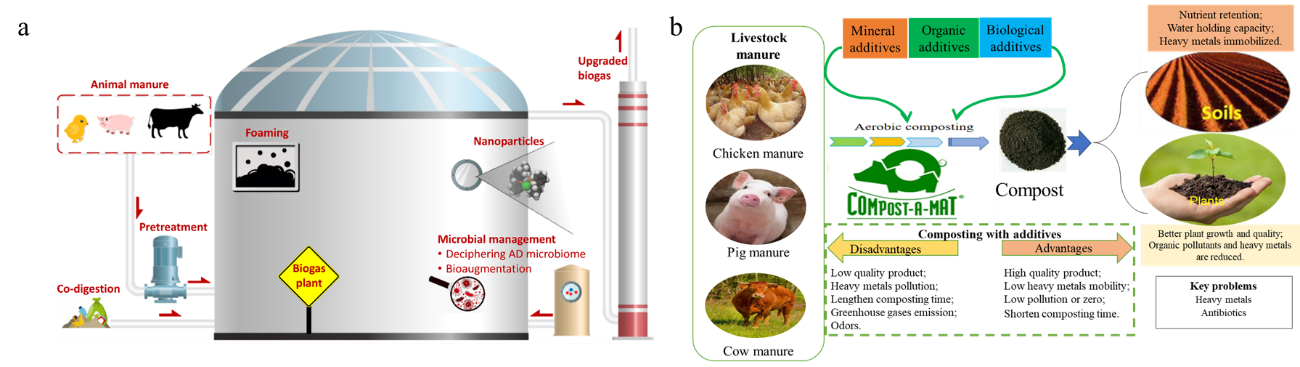 在众多粪污处理技术中,厌氧发酵、好氧堆肥是最为成熟、商业化应用最为广泛的粪污处理技术。但厌氧发酵技术具有建设成本高、专业性强、补贴依存度高、沼液处理难等问题,还有较大提升空间,通过联合厌氧发酵、生物强化、导电纳米材料、沼气提纯等研究,将大大提高厌氧发酵效率和沼气工程的经济性(图1a)。好氧堆肥投资少、操作简单,是发展中国家最受欢迎的畜禽粪污处理技术,然而氮素损失、温室气体排放、重金属和抗生素残留等问题制约了其应用,功能添加剂的研发是当前研究热点,如何平衡经济效益与环境影响以及添加剂长期应用的环境效应评估至关重要(图1b)。