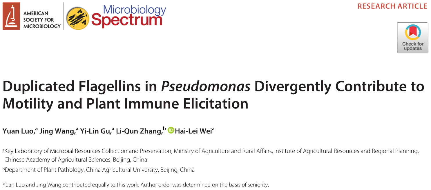 近日,中国农科院农业微生物资源团队以土壤有益荧光假单胞菌为对象,系统研究了多鞭毛蛋白在运动性与免疫保护方面功能机制。相关成果以“Duplicated flagellins in Pseudomonas divergently contribute to motility and plant immune elicitation”为题,发表在美国微生物学会著名学术期刊《Microbiology Spectrum》上。