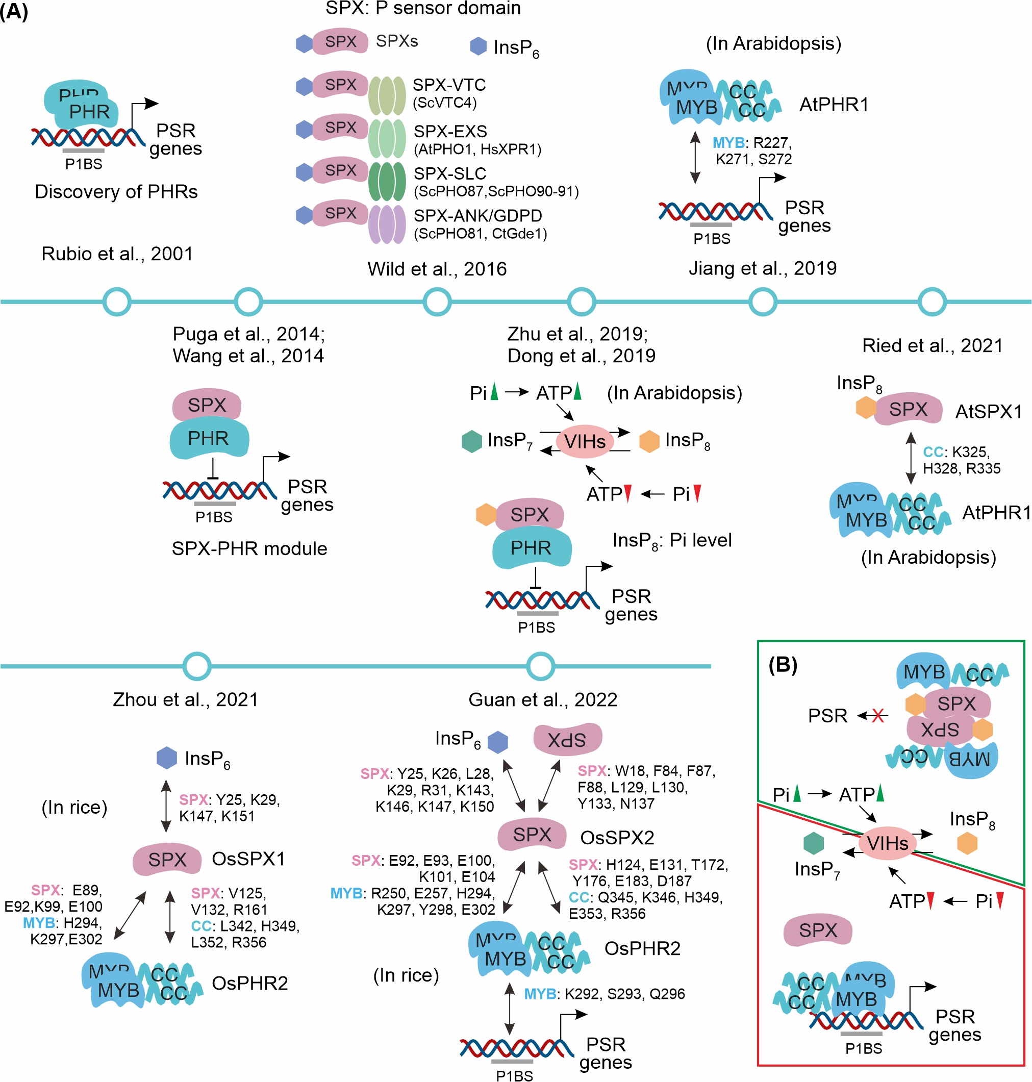 该综述系统总结了植物磷信号调控的核心模块的发现过程及其作用模式。植物中磷养分核心调控信号由一类MYB转录因子PHRs来介导,而PHRs的转录调控活性受到SPXs(磷信号抑制因子)蛋白的调控。近年来研究发现,肌醇磷酸(InsPs)类分子作为细胞内磷素水平的“信号分子”,其含量受到一类双功能酶-肌醇磷酸激酶磷酸酶(VIHs)的控制,而肌醇磷酸(InsPs)分子通过改变PHRs和SPXs的互作来调节植物缺磷反应。随着近年来SPX-InsP-PHR复合体的晶体结构解析,该模块的工作模式逐渐被建立:当磷素供应充足时,细胞内ATP含量上升,VIHs发挥激酶活性,从而合成InsP8,而InsP8与SPXs、PHRs形成2:2:2的复合体,抑制PHRs激活缺磷信号;当缺磷时,VIHs发挥磷酸酶活性,细胞内InsP8含量下降,SPX-InsP-PHR复合体解聚,PHRs转录因子形成二聚体激活下游缺磷响应基因的表达,启动缺磷响应。
