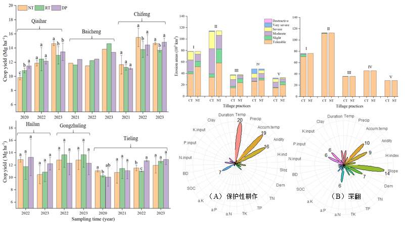 保护性耕作(免耕+秸秆覆盖)在东北黑土地区域适宜性不明确。研究团队利用长期定位试验、区域联网研究、荟萃分析、随机森林、侵蚀模型等方法进行了量化评估。结果发现,保护性耕作在半干旱区域增加耕层土壤容重,但对半湿润区域土壤容重影响不显著;显著提高了土壤含水量,且在半湿润区增幅更大;降低了土壤温度,尤其是关键生长季玉米苗期土壤温度(可能导致低温区域种子萌发困难),提高了土壤养分。区域分析表明,保护性耕作东北黑土区全域增产不明显1.2%,但在辽河平原增产显著14.6%,其中松嫩平原南部、辽河平原西部与内蒙古科尔沁沙地等风蚀、干旱的区域增产效果较好;此外,该技术在土壤风蚀(大兴安岭南部和辽河平原等地区)和土壤水蚀(大兴安岭沿麓、小兴安岭沿麓、长白山丘陵等陡坡地带)高发区域降低土壤侵蚀幅度最大,阻控土壤流失效果最佳。