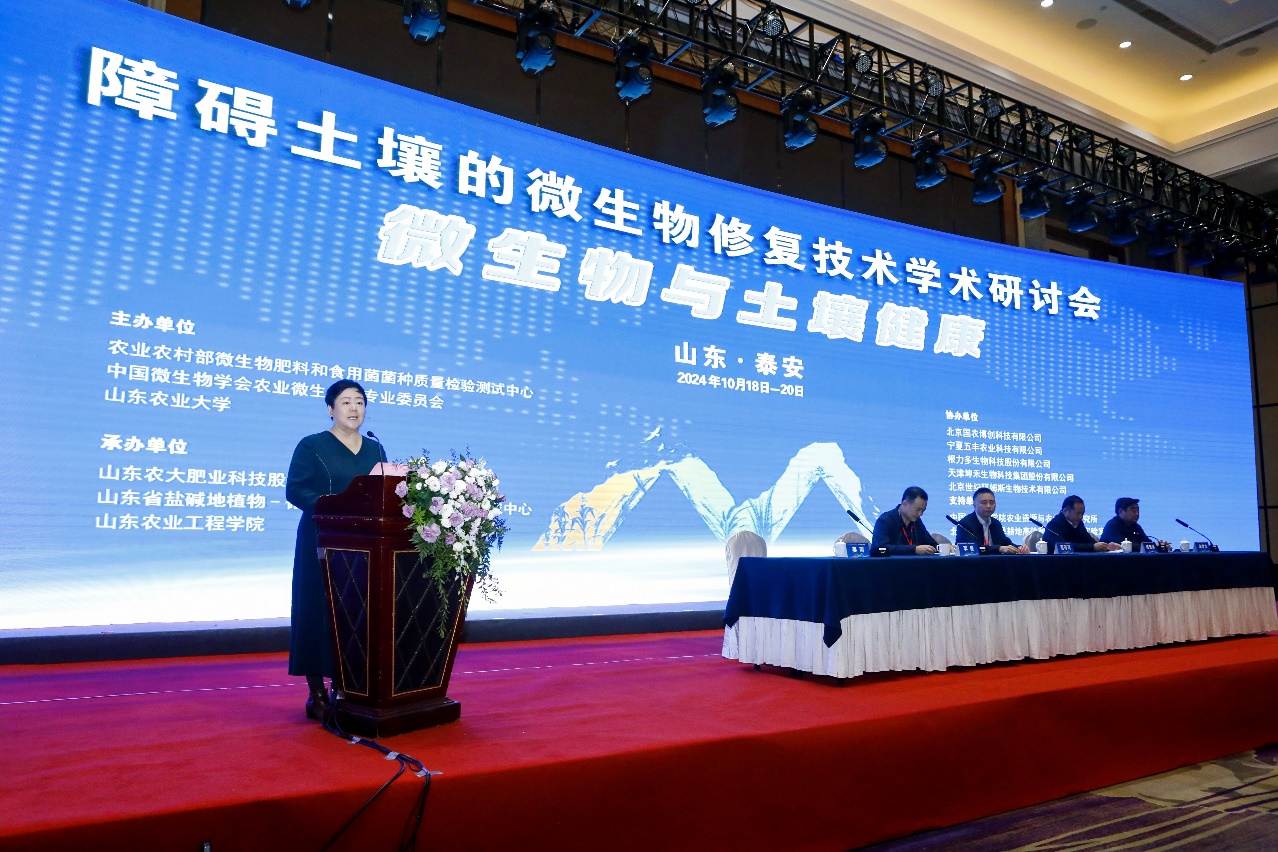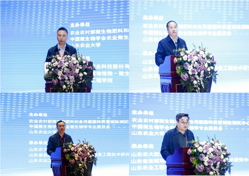 中国农业科学院农业资源与农业区划研究所副所长易可可研究员、山东农业大学党委副书记嵇景涛、中国微生物学会监事长李俊研究员、山东农大肥业科技股份有限公司马学文董事长出席并致辞。会议由农业农村部微生物肥料和食用菌菌种质量检验测试中心主任、中国微生物学会农业微生物学专业委员会主任姜昕研究员主持。