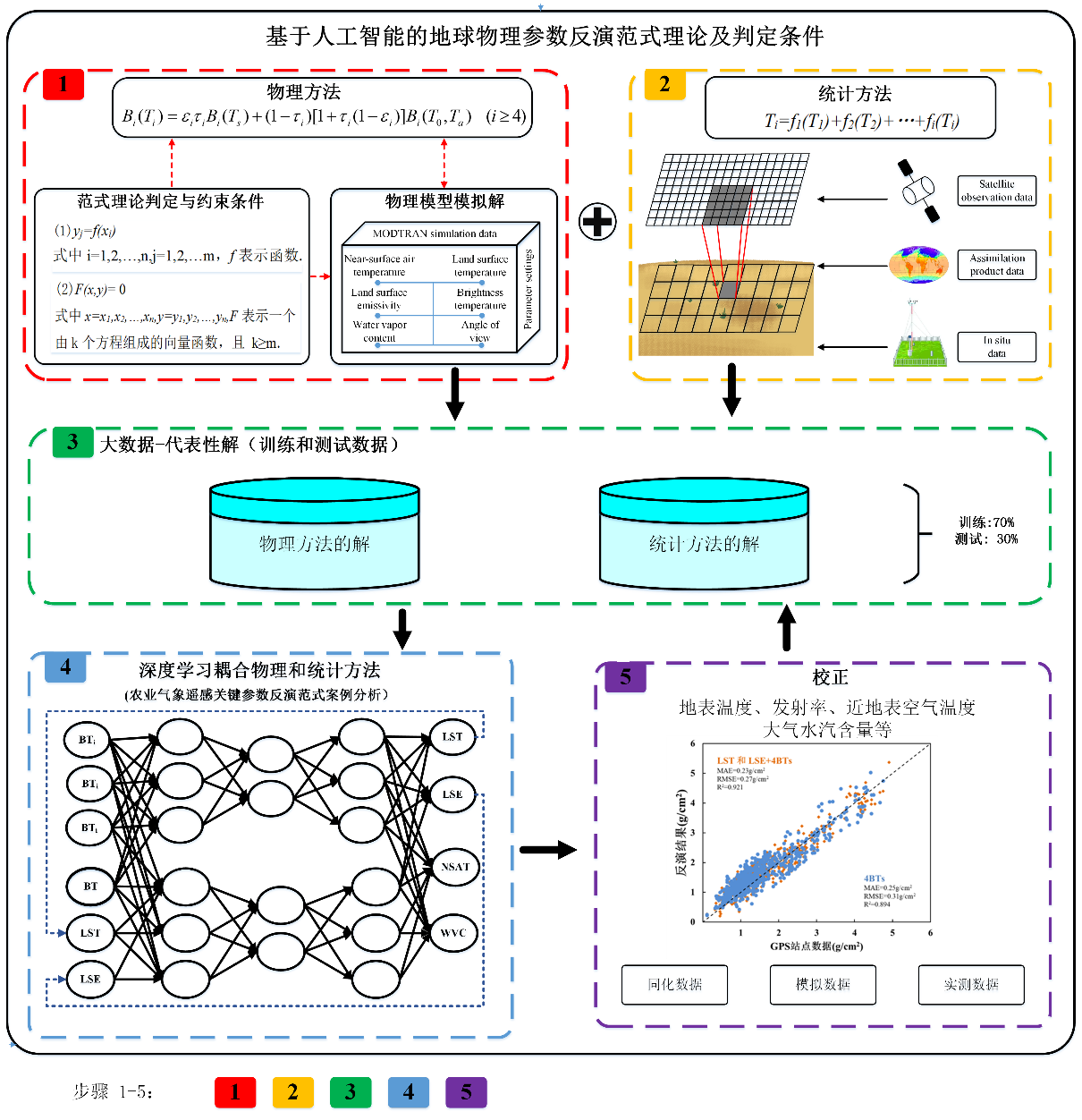 研究团队通过近20年的研究,在人工智能地球物理参数反演方面做了一些原创性研究工作(https://b23.tv/MbrOAvS):(1)提出了基于人工智能耦合物理和统计方法的地球物理参数反演范式理论和判定条件;(2)提出了基于人工智能同时反演土壤水分和地表温度范式(视频讲座:https://b23.tv/Ln7PQhO);(3)提出了基于人工智能同时反演地表温度和发射率范式(视频讲座:https://v.douyin.com/DH91RfF/);(4)提出了基于人工智能反演近地表空气温度范式(视频讲座:https://v.douyin.com/DHH5Md9/);(5)提出了基于人工智能反演大气水汽含量范式。该理论提出通过物理逻辑推理,从理论上构建物理方法,并在物理方法的基础上构建泛化的统计方法;利用多源数据产生的物理方法和统计方法代表性的解构成深度学习的训练和测试数据库,从而实现深度学习耦合物理和统计方法。提出了判定形成范式的条件:(1)深度学习输入变量和输出变量之间必须有因果关系;(2)输入和输出参数之间必须能从理论上构造完整的闭合方程组。中国国际大数据产业博览会专家组评审委员会对研究成果给予了高度肯定,基于人工智能地球物理参数反演范式理论的提出在地球物理参数反演史上具有里程碑意义,突破了传统方法的局限,系统性地提高了参数反演精度,为打造基于人工智能地球物理参数反演的“ChatGPT”提供了理论和技术方案支持。