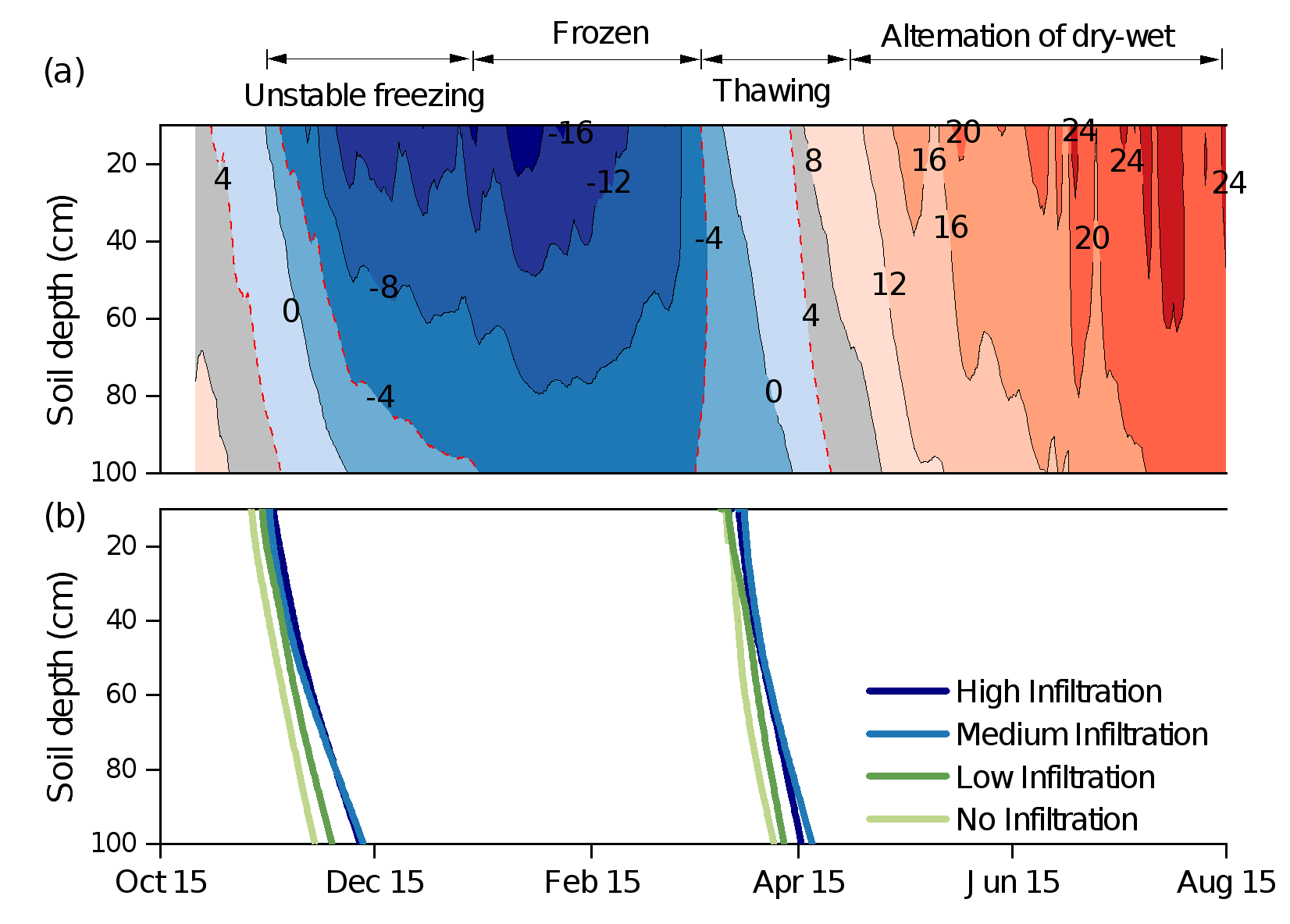 本研究通过在冻前控制土壤水分入渗到距沟壁10、30和50 cm的小区试验(三次重复)。研究结果表明:冻前和融后高入渗处理的接近饱和区域更靠近地表和沟壁,融后裂隙发育位置与土壤水分近饱和区域的深度相近。沟壁土体冻结于11月中旬从表层开始,在24天内推移到1 m深土壤剖面;土体融化开始于3月中旬,分别从表层和1 m深度向中部渗透,在11天内结束。冬季冻结前土壤水分状况通过控制沟壁剖面土壤的冻结深度,从而决定了春季融后沟壁土体裂隙的深度和崩塌关键时机。
