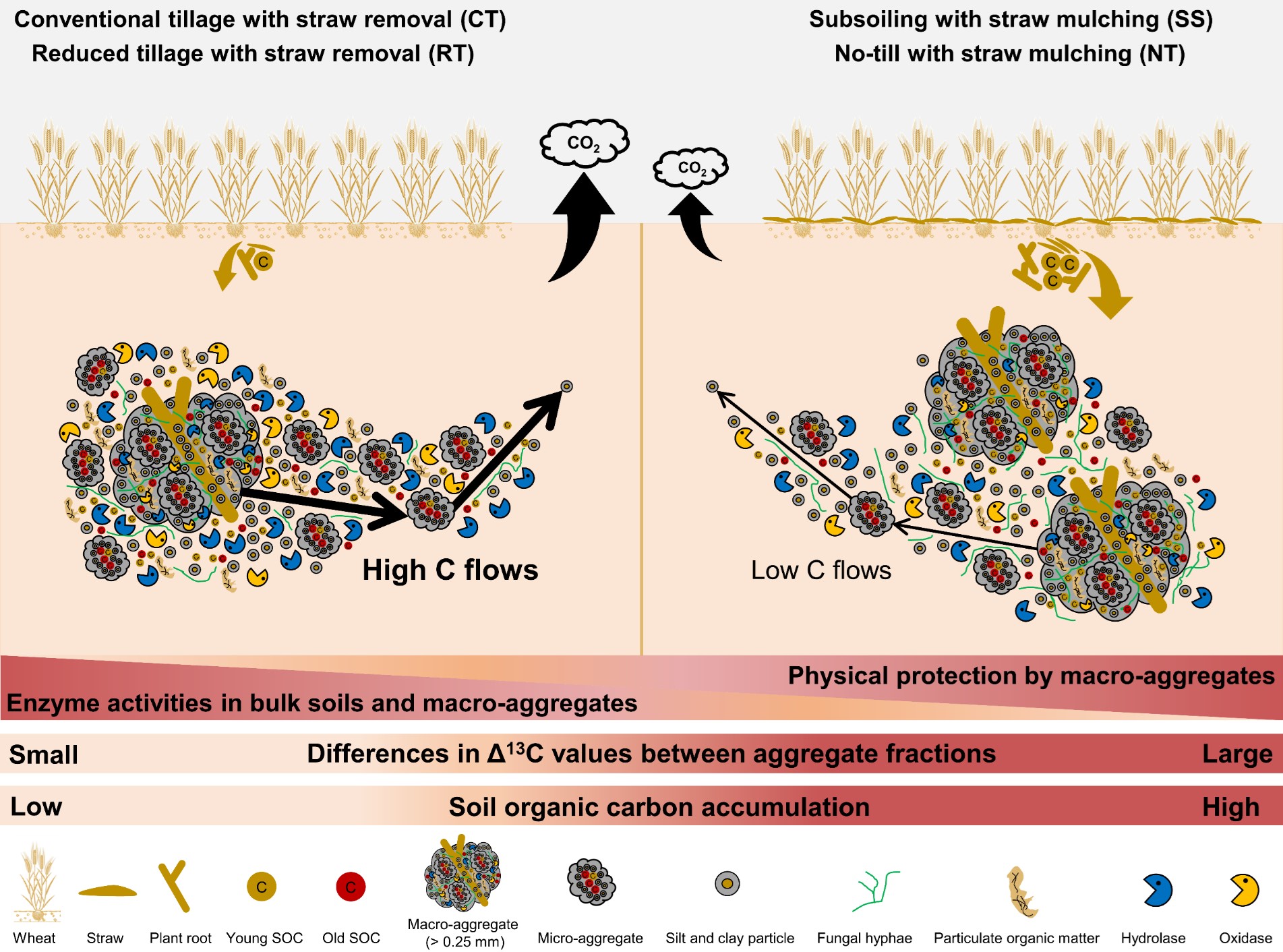 研究团队基于农业部洛阳旱地农业重点野外科学观测试验站21年保护性耕作田间定位试验,通过测定0–10 cm土层团聚体中的水解酶和氧化酶活性和土壤有机碳矿化水平,并利用13C自然丰度法量化了团聚体间碳流路径与强度,从而阐明保护性耕作对土壤有机碳积累的影响机制。研究结果表明,与常规耕作和少耕秸秆移除相比,免耕和深松秸秆覆盖通过降低大团聚体中的水解酶和氧化酶活性以及碳从大团聚体流向小团聚体的强度,从而将新碳更好地保护在大团聚体中,减少有机碳损失,进而促进土壤碳积累。研究成果有助于深化对保护性耕作土壤固碳机制的理解,也可为应对气候变化提供科技支撑。