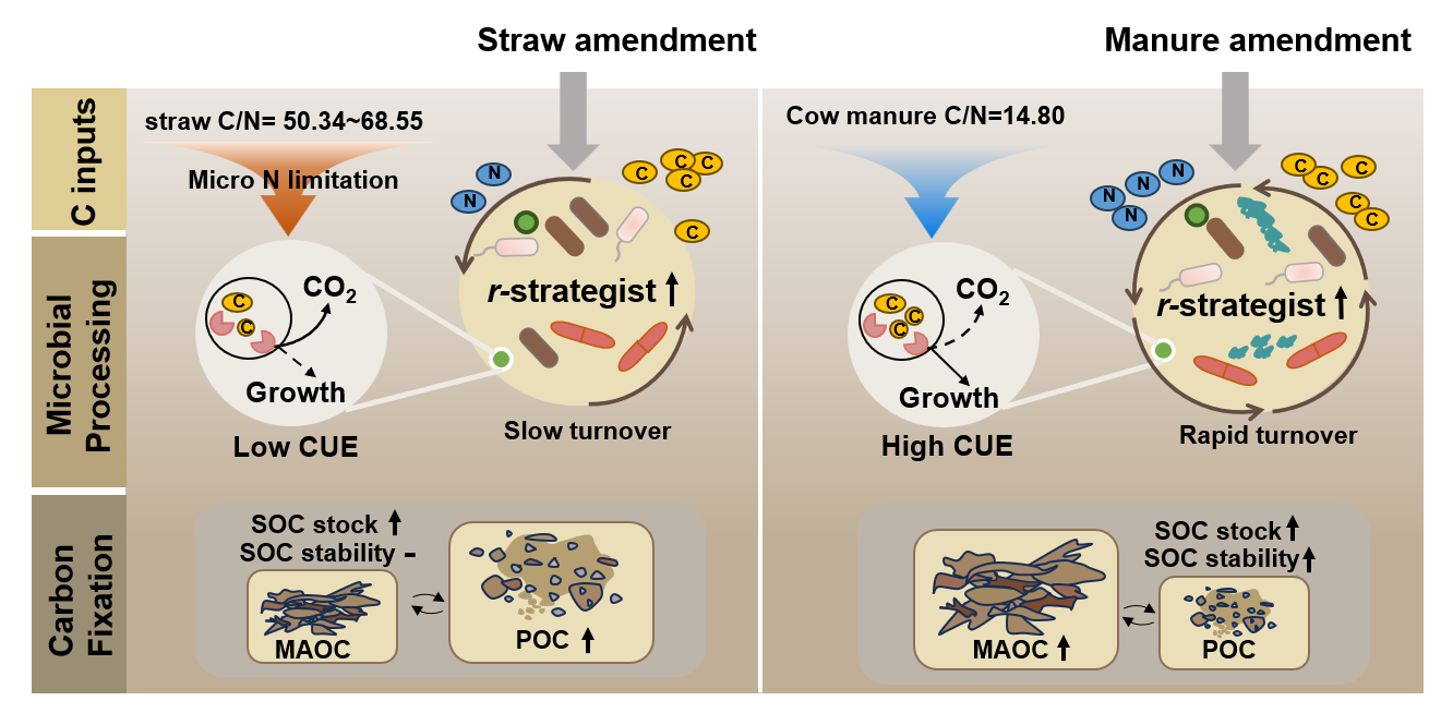 图. 秸秆和粪肥调控微生物碳利用效率和土壤碳固存的差异